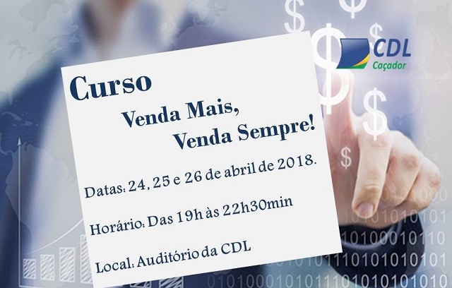A Câmara de Dirigentes Lojistas (CDL) de Caçador realiza nos dias 24, 25 e 26 de abril, das 19h às 22h30, em seu auditório, o curso “Venda mais, venda sempre”, que tem como objetivo oferecer qualificação aos profissionais que atuam no comércio, bem como aos interessados nesta área de atuação. A carga horária será de 12 horas aula.