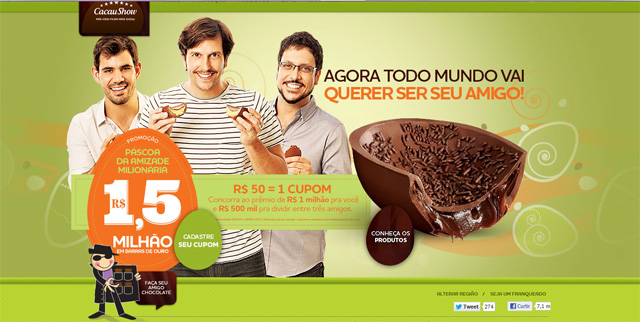 E a cada R$ 50,00 em compras receba um código, cadastre o código no site, responda a pergunta e concorra a R$ 1 milhão, indique até três amigos para concorrer com você R$ 500.000,00.