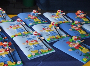 Para finalizar as atividades foi entregue a cada aluno um livro com as atividades desenvolvidas durante o projeto, um CD com as músicas trabalhadas e uma ponteira de lápis do palhaço, que simboliza a alegria do circo.