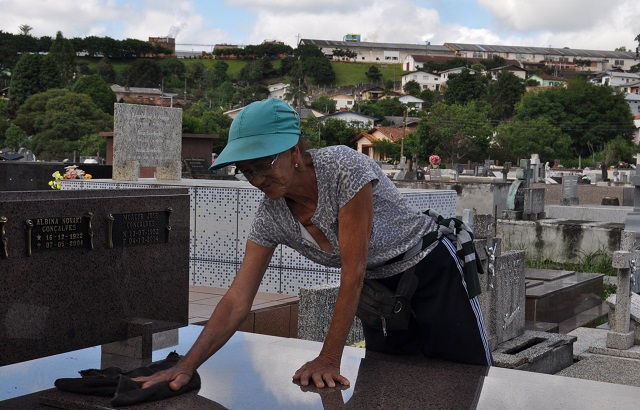 Há 40 anos, a dona Dinacir Fiorese trabalha no lugar onde ninguém gostaria de estar: no cemitério. A aposentada de 69 anos faz, de forma autônoma, a limpeza de túmulos no cemitério municipal de Caçador, e em troca ganha uma renda extra.