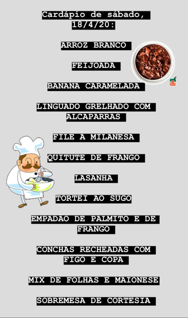 O cardápio é lançado com um dia de antecedência e os pedidos podem ser feitos pela manhã. Confira o que tem para sábado, dia 18 de abril.