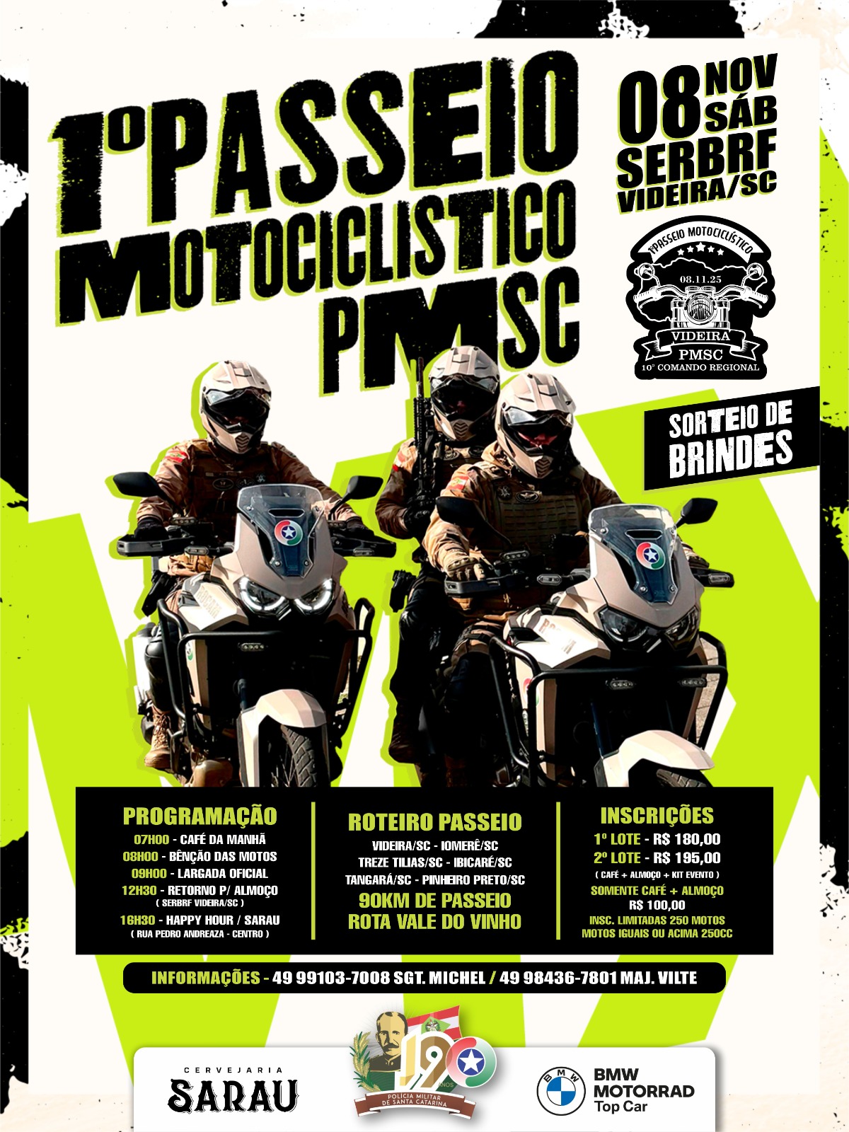 1º Passeio Motociclístico PMSC, no dia 8 de novembro de 2025, com saída e