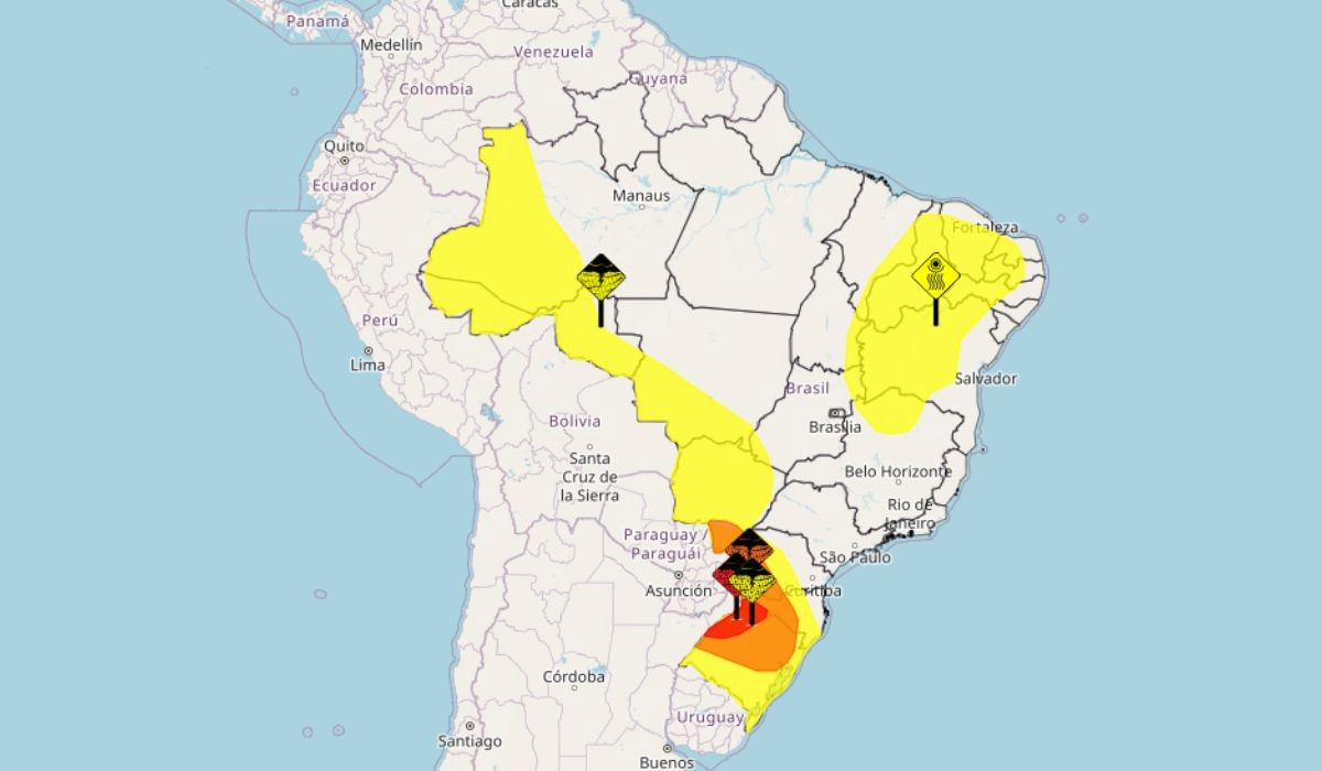 alerta amarelo, de perigo potencial, abrange quase toda a região Sul.