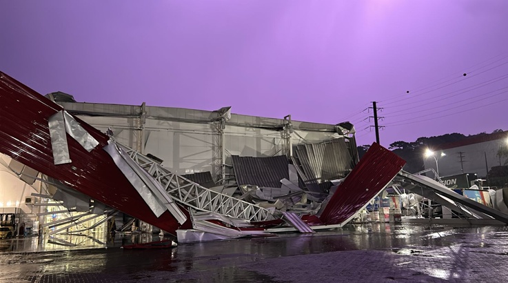 estragos semelhantes aos de um tornado, como destelhamentos, queda de árvores e