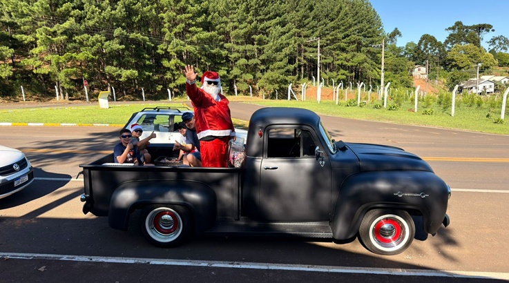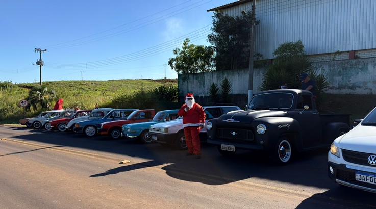 do grupo percorreram os bairros com seus veículos antigos, com o Papai Noel a