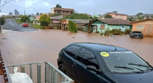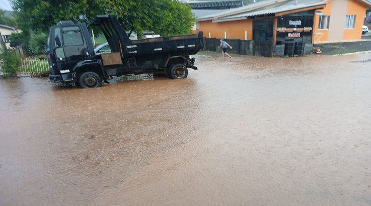 por volta das 18h, provocou enxurradas e alagamentos no centro de Timbó Grande,
