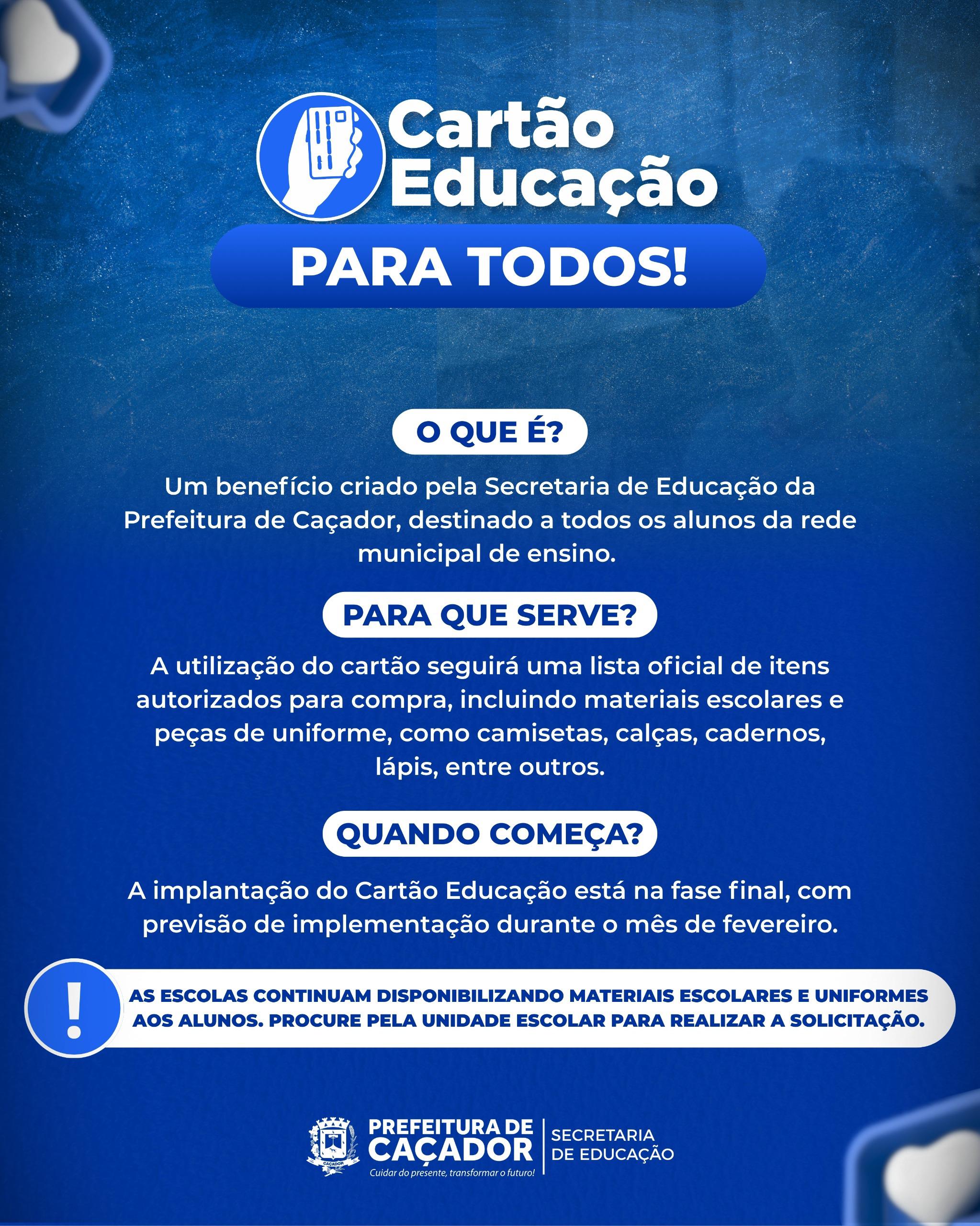 Educação, informa que a implantação do Cartão Educação está na fase final, com