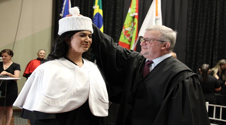 Em ato simbólico, a Reitora recebeu a veste branca, insígnia