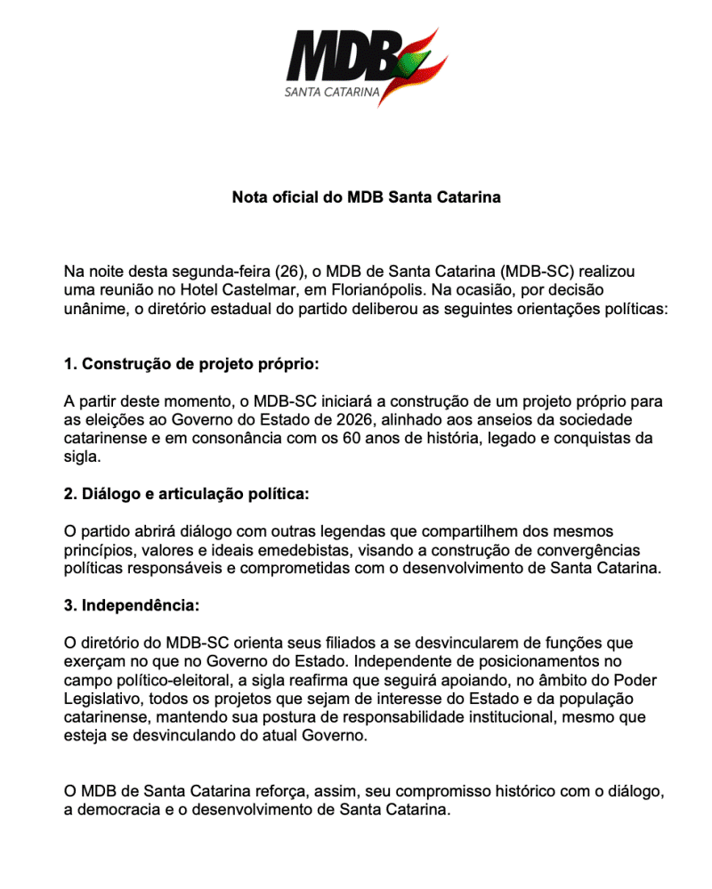 O diretório estadual do MDB de Santa Catarina deliberou, na
