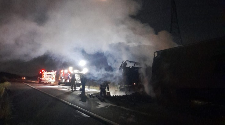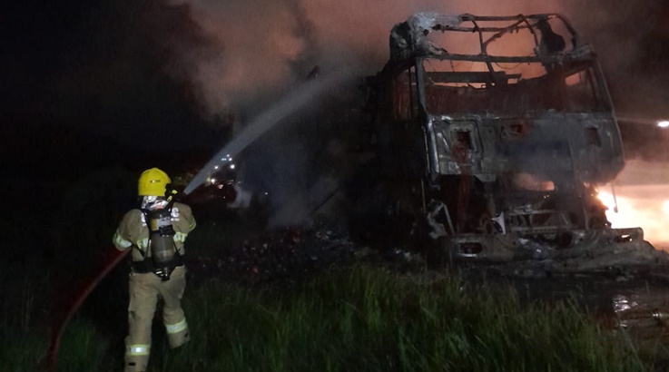 carreta baú carregada com embutidos, que estava em chamas. O fogo encontrava-se