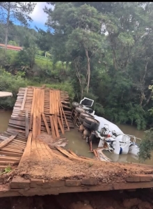De acordo com as primeiras informações, o veículo — uma betoneira carregada de concreto — trafegava pela ponte quando a estrutura cedeu. O local possui sinalização indicando limitação de carga de até 10 toneladas. A estimativa é de que o caminhão ultrapassasse 40 toneladas, bem acima do permitido.