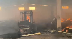 empilhadeiras e um veículo Saveiro, todos completamente destruídos pelo