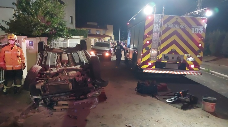 O veículo Volkswagen Up encontrava-se capotado sobre a via,