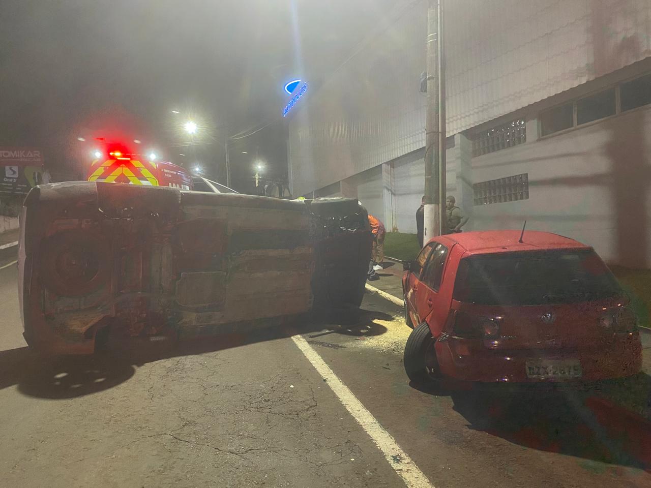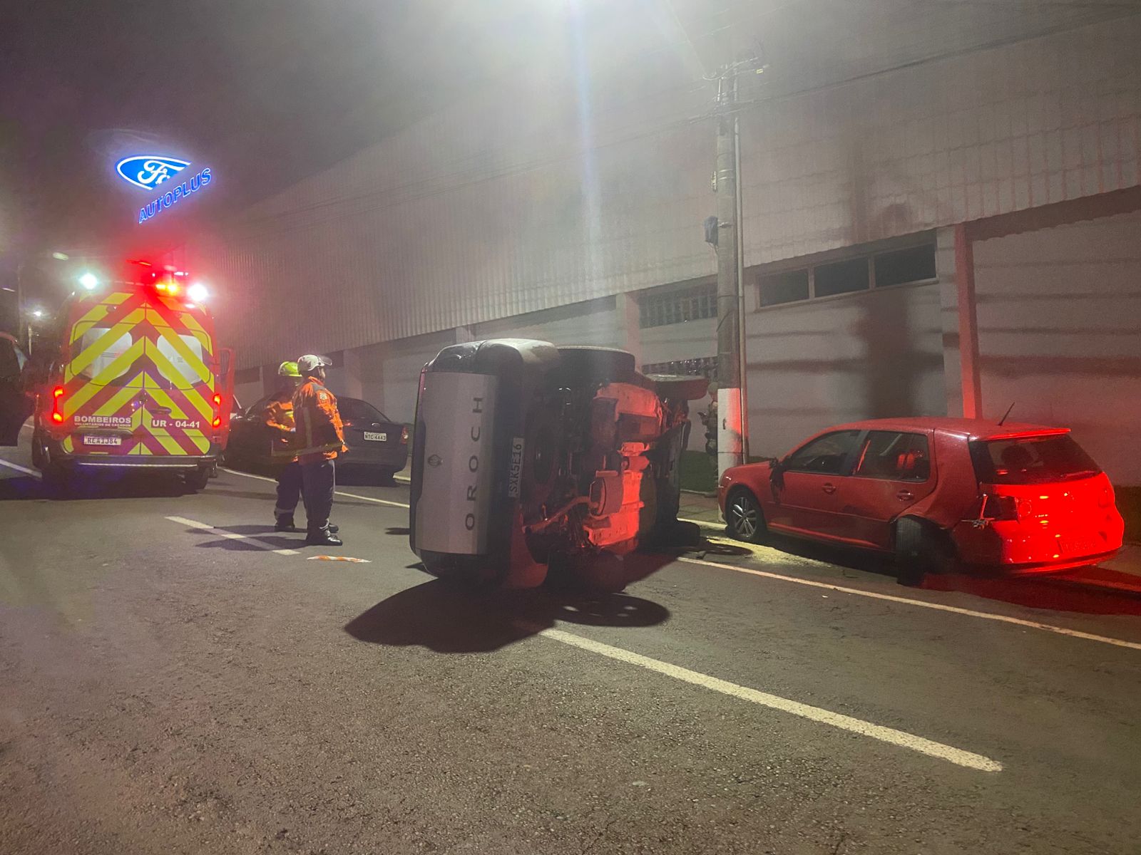 Ford Auto Plus, no bairro Vila Paraíso. No local, uma picape Oroch tombou no meio da via após colidir
