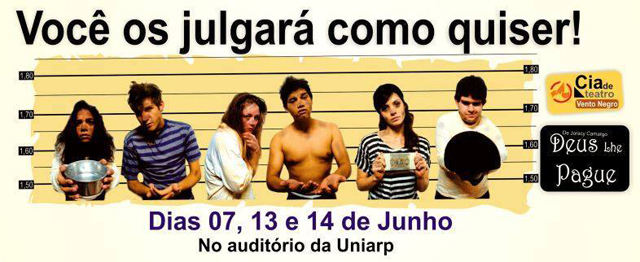 A CIA de Teatro Vento Negro apresenta nos dias 13 e 14 de junho, no Auditório da UNIARP, a peça de teatro “Deus lhe pague, de Joracy Camargo. SERVIÇO: Ingressos com os atores.