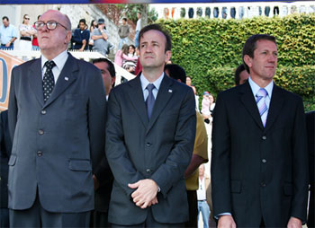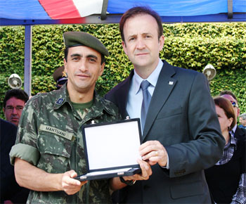 Nesta imagem o Prefeito Saulo Sperotto, presta uma homenagem ao Instrutor Chefe 1º Sargento Claudinei Mantuani pelos 80 anos de criação do Tiro de Guerra de Caçador e também pelos relevantes serviços prestados a comunidade e pela excelente condução frente a presidência da comissão Central Organizadora do Desfile Cívico de 7 de Setembro de 2009.