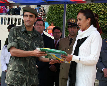 O 1º Sargento Claudinei Mantuani, entregando a senhora Ivonete D’Agostini, Diretora da Escola Municipal de Educação Básica Esperança, representando no ato todos os diretores das escolas municipais o kit do Projeto Civismo , projeto este denominado NOSSA BANDEIRA – ESCOLA DE CIVISMO,sendo este de iniciativa do Centro de Comunicação Social do Exercito.O kit contém uma bandeira, um CD com hinos e canções,visando constituir junto com as escolas municipais e o Tiro de Guerra pólos difusores de civismo, cidadania e patriotismo. Sensacional a idéia.